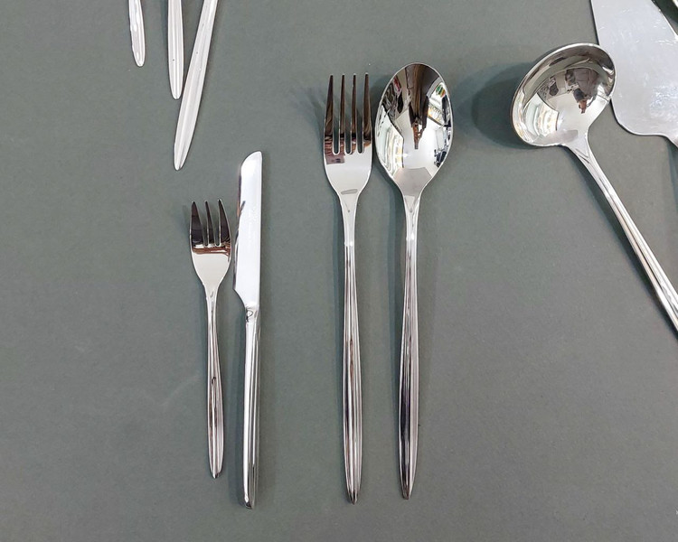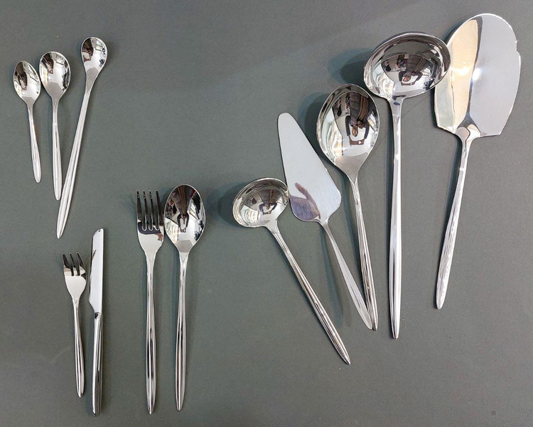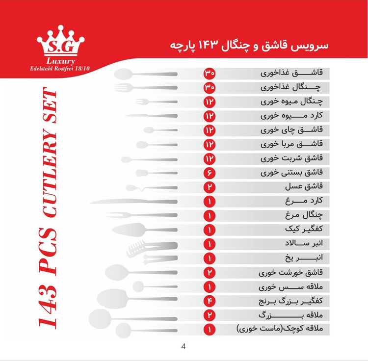 شامل: 30قاشق و چنگال غذا خوری 12قاشق شربت مربا چای خوری کارد و چنگال میوه 4عدد کفگیر 2عدد ملاقه بزرگ دو عدد ملاقه کوچک