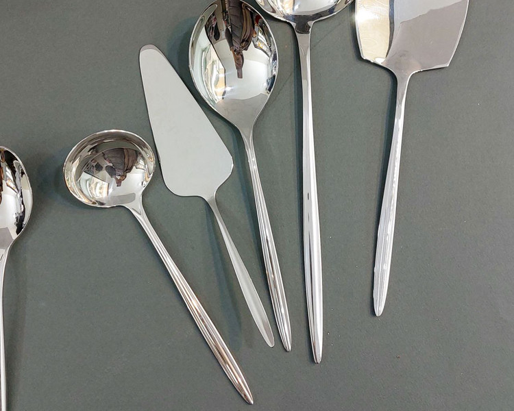 30قاشق و چنگال غذا خوری 12قاشق شربت مربا چای خوری کارد و چنگال میوه 4عدد کفگیر 2عدد ملاقه بزرگ دو عدد ملاقه کوچک