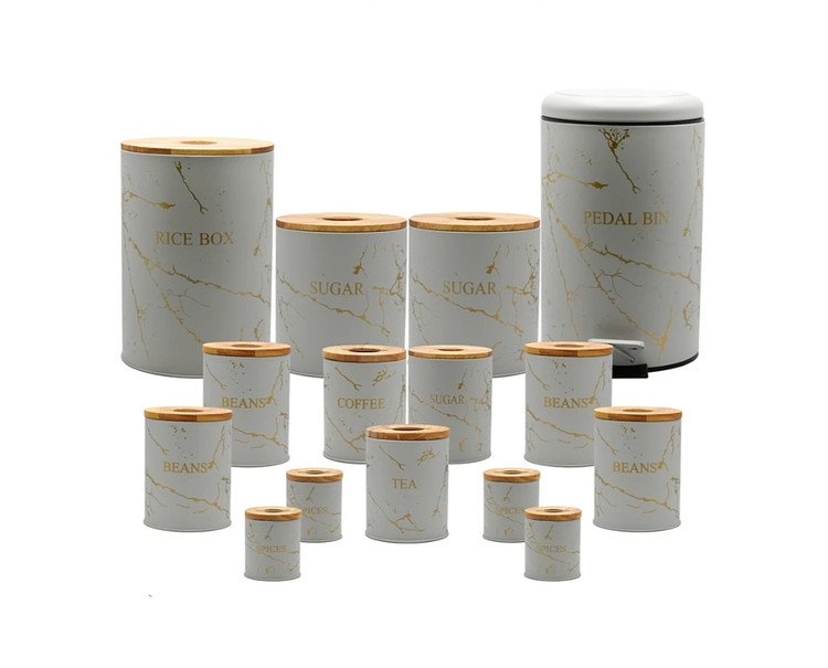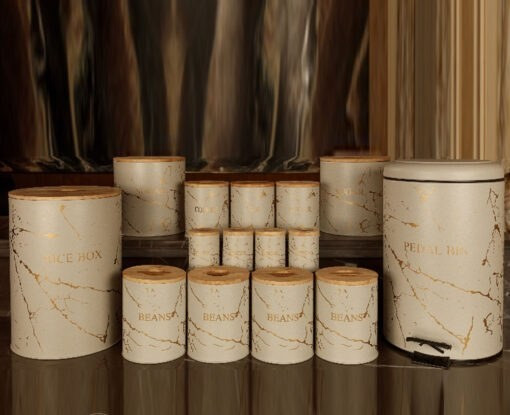 سرویس آشپزخانه 15 پارچه بی وی کی درب چوبی طرح ماربل طلایی کد 855596